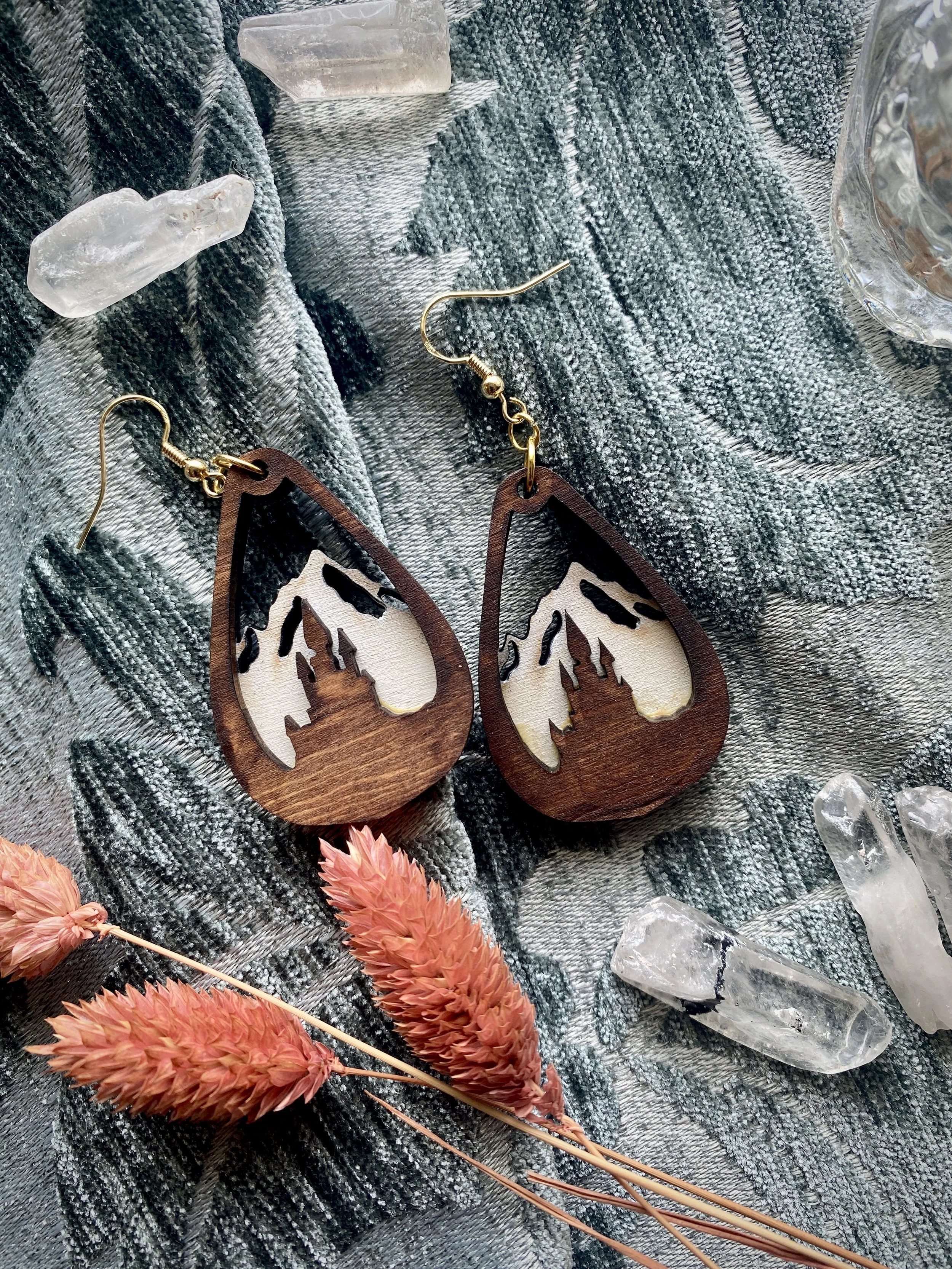 These earrings are inspired by fantasy novels I’ve read. I cut two separate tear-drop shapes with different images I’ve created inside them. One mountain and one castle. Once they are painted or stained, I glue them together with wood glue. 2025.
