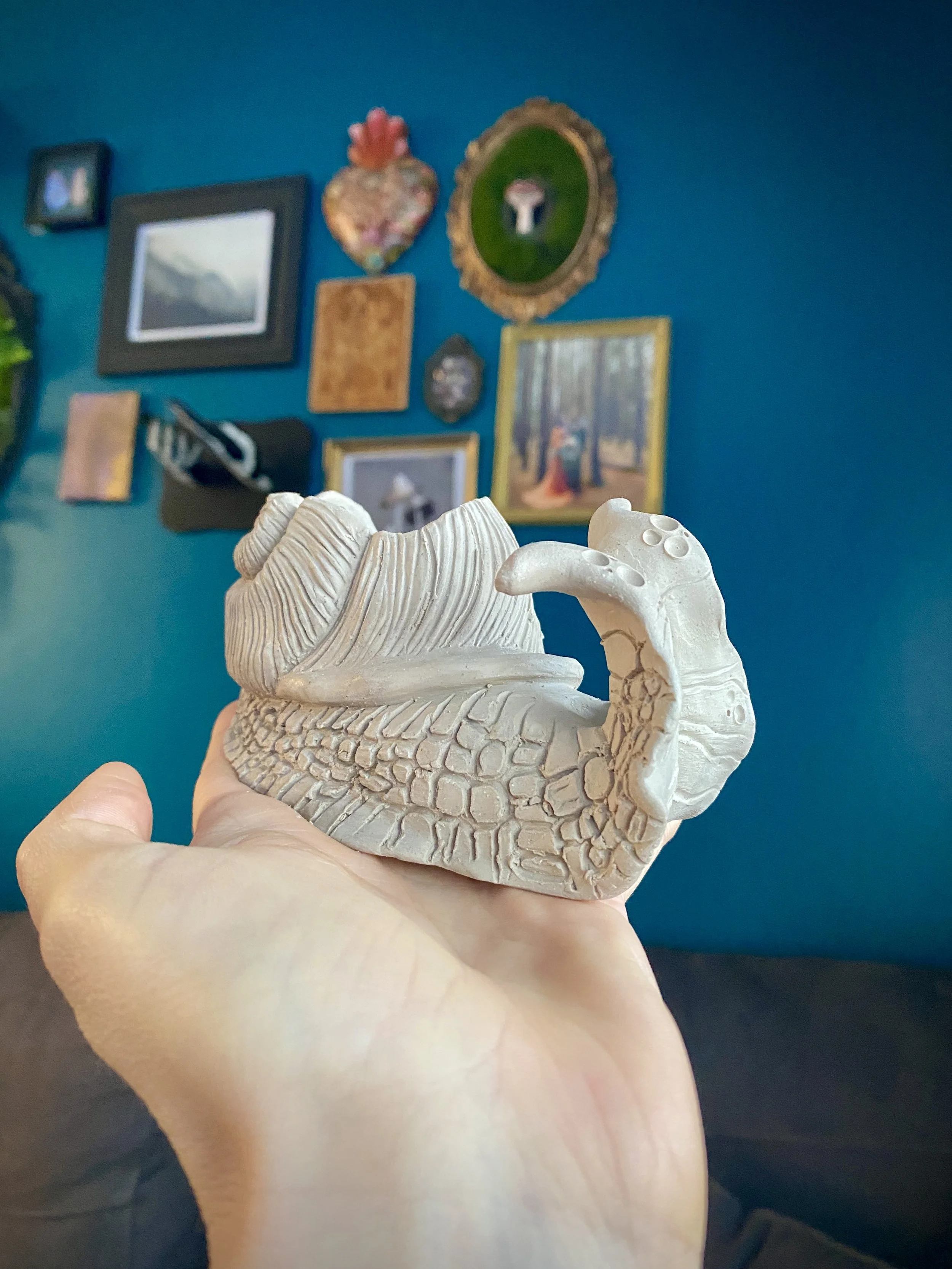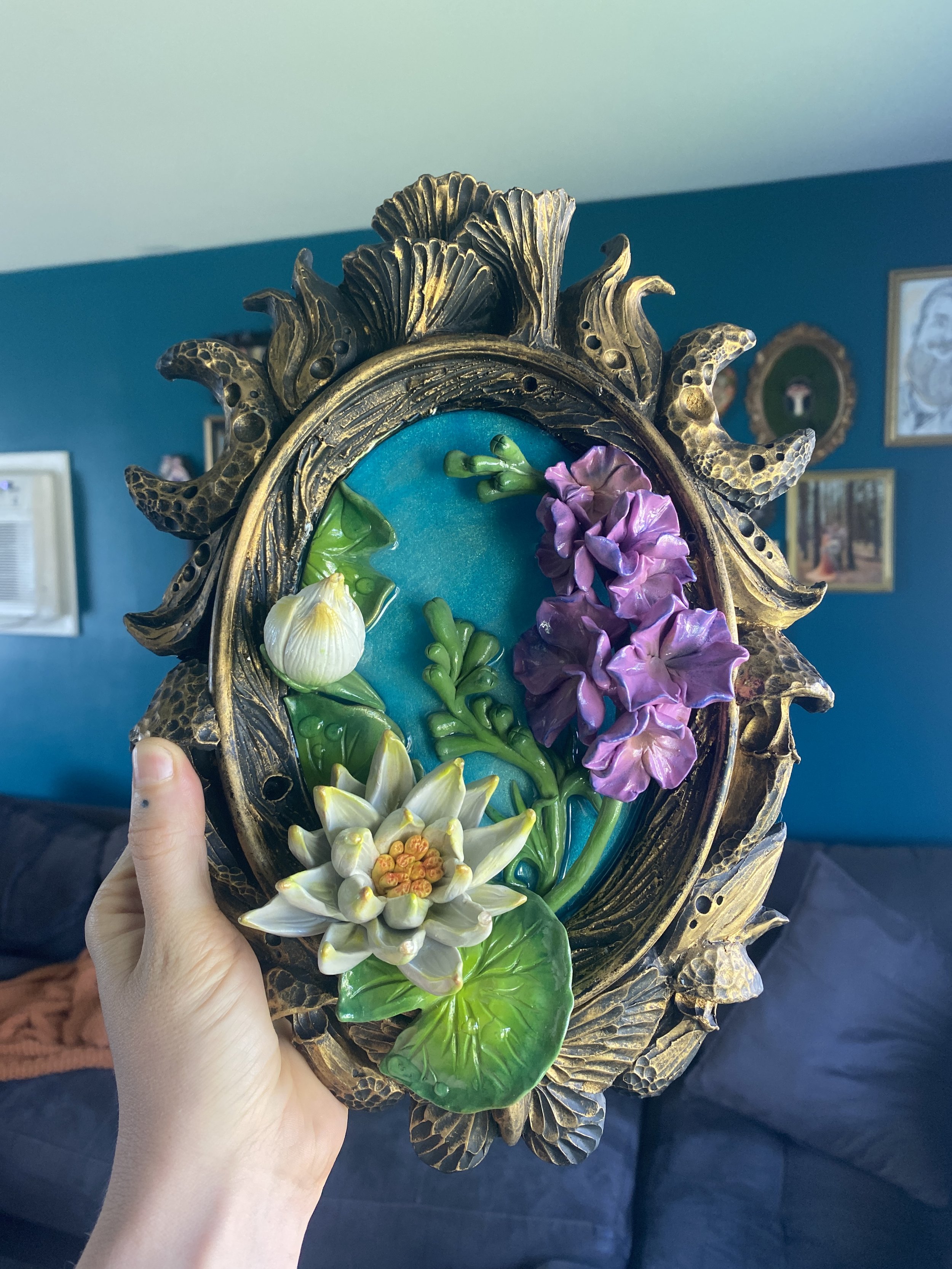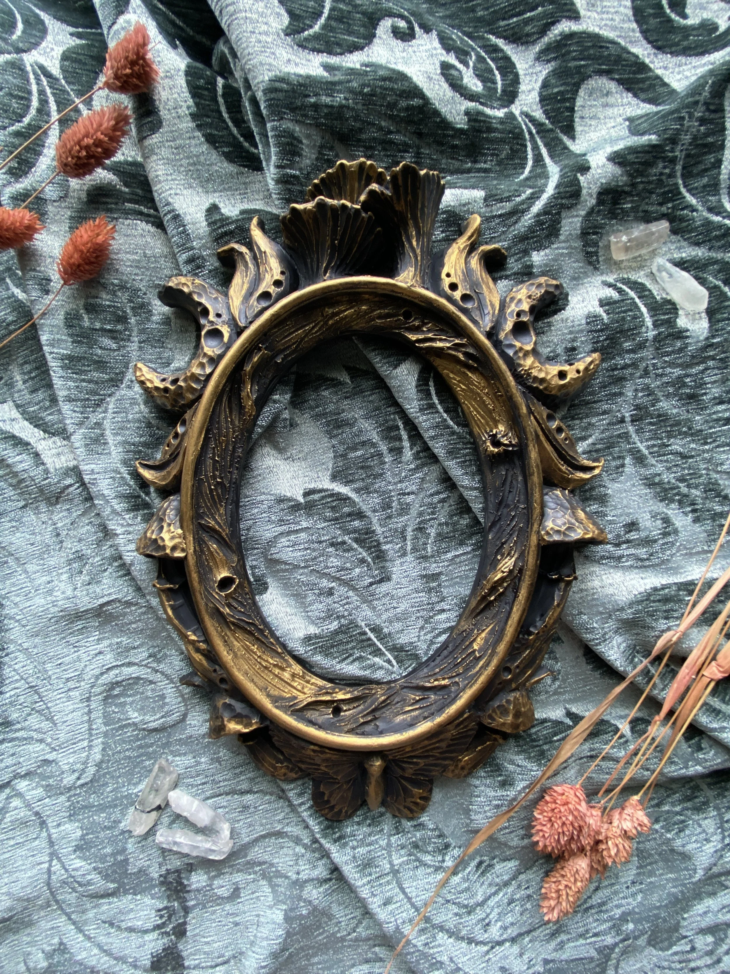 Here is the before and after of my hand-sculpted frames for my art pieces. I first sculpt the frame in a oil-based clay. Then I make a mold out of silicone and cast it in resin. It’s then buffed with gold rub and buff.