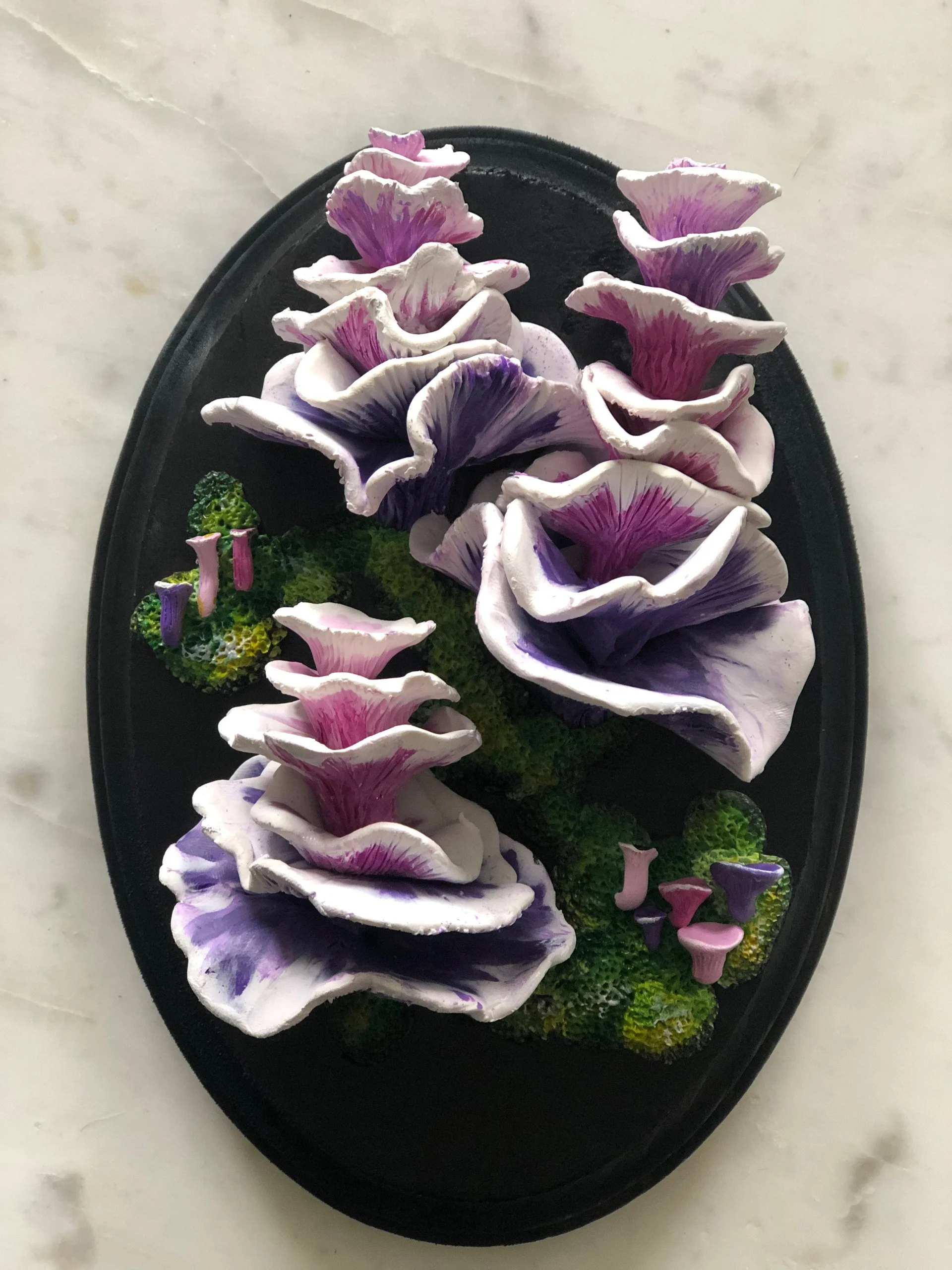 Used polymer clay, foam, wire, aluminum foil, moss, and acrylic paint to create a custom card box display for my client’s wedding. May 2023.